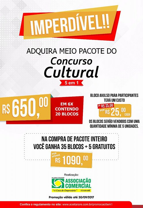 Aproveite essa chance para participar também do Concurso Cultural 5 em 1, e oferecer esse diferencial aos seus clientes! Realizaremos ainda esse ano, dois sorteios que somam um total de 10 prêmios, contemplando clientes e vendedores. Contate-nos pelo telefone (15)3531-3000 ou venha nos fazer uma visita, que teremos prazer em atendê-lo!