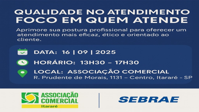 SEBRAE e Associação Comercial de Itararé apresentam: Qualidade no Atendimento – Foco em Quem Atende Você é a peça-chave para o sucesso no atendimento! Neste curso GRATUITO, descubra como: Postura e comunicação profissional geram con...